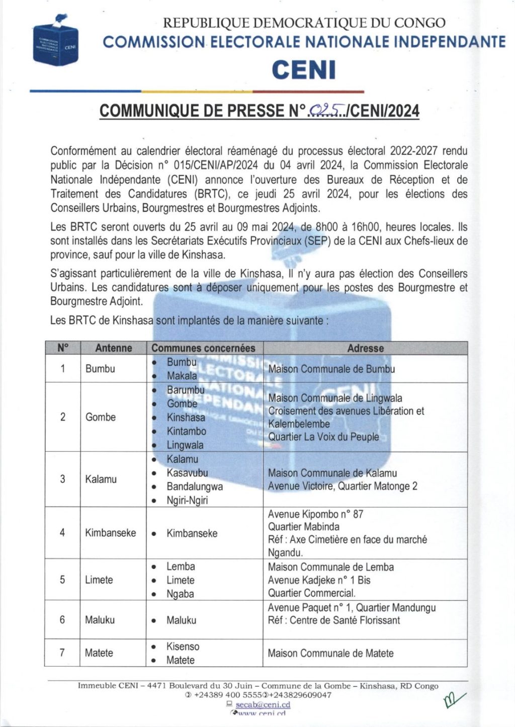 « Conformément au calendrier électoral réaménagé du processus électoral 2022-2027 rendu public par la Décision n° 015/CENI/AP/2024 du 04 avril 2024, la Commission Electorale Nationale Indépendante (CENI) annonce l’ouverture des Bureaux de Réception et de Traitement des Candidatures (BRTC), ce jeudi 25 avril 2024, pour les élections des Conseillers Urbains, Bourgmestres et Bourgmestres Adjoints » peut-on lire sur ce communiqué posté sur le comté X de la centrale électorale.