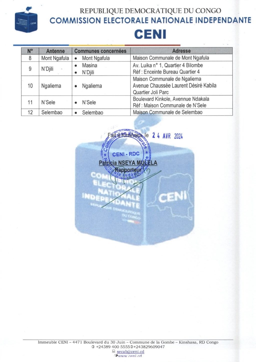 Ces bureaux seront ouverts du 25 avril au 09 mai 2024, de 8h00 à 16h00, heures locales. Ils sont installés dans les Secrétariats Exécutifs Provinciaux (SEP) de la CENI aux Chefs-lieux de province, sauf pour la ville de Kinshasa où il n’y aura pas élection des Conseillers Urbains. « Les candidatures sont à déposer uniquement pour les postes des Bourgmestre et Bourgmestre Adjoint ».