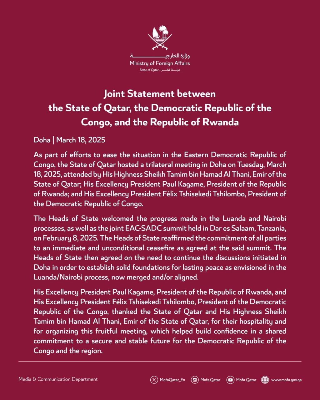 – L’État du Qatar a accueilli une réunion trilatérale ce mardi entre le Président Félix Tshisekedi (RDC), le Président Paul Kagame (Rwanda) et l’Émir Cheikh Tamim bin Hamad Al Thani (Qatar). Cette rencontre, organisée dans le cadre des efforts diplomatiques pour apaiser la situation sécuritaire dans l’Est de la RDC, a permis de réaffirmer l’engagement des parties en faveur d’un cessez-le-feu immédiat et de la poursuite des négociations.