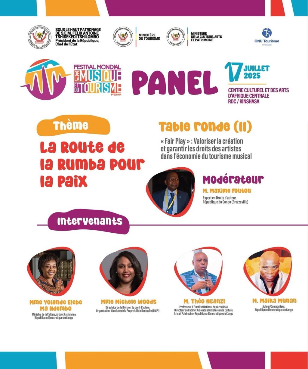 Kinshasa, RDC – Le droit d’auteur, pierre angulaire de la protection des œuvres artistiques, a été au centre des discussions jeudi à Kinshasa, dans le cadre du Festival mondial de la musique et du tourisme. Un panel axé sur le thème “Valoriser la création et garantir les droits des artistes dans l’économie du tourisme musical” a mis en lumière l’importance de la formation sur cette question, devenue cruciale dans un secteur en pleine expansion.
