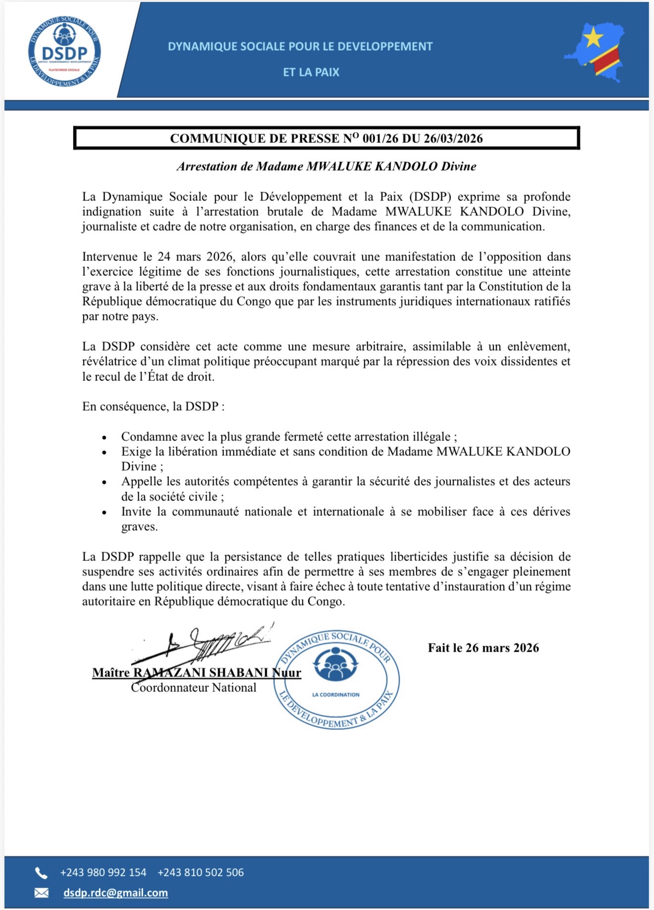 La Dynamique Sociale pour le Développement et la Paix (DSDP) a exprimé sa vive indignation à la suite de l’arrestation de Madame Mwaluke Kandolo Divine, journaliste et cadre de l’organisation, chargée des finances et de la communication.