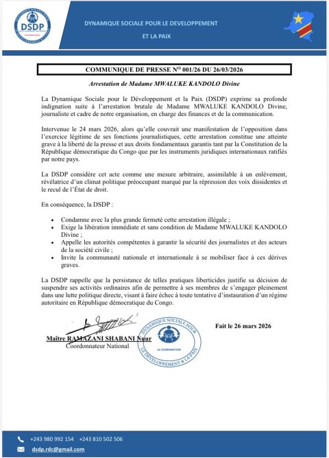 Actualité RDC : la DSDP dénonce l’arrestation de la journaliste et activiste pro-démocratie Divine Mwaluke et exige sa libération immédiate RDC : la DSDP dénonce l’arrestation de la journaliste et activiste pro-démocratie Divine Mwaluke et exige sa libération immédiate AuthentikIl y'a 1 moisIl y'a 1 moisContinue de lire